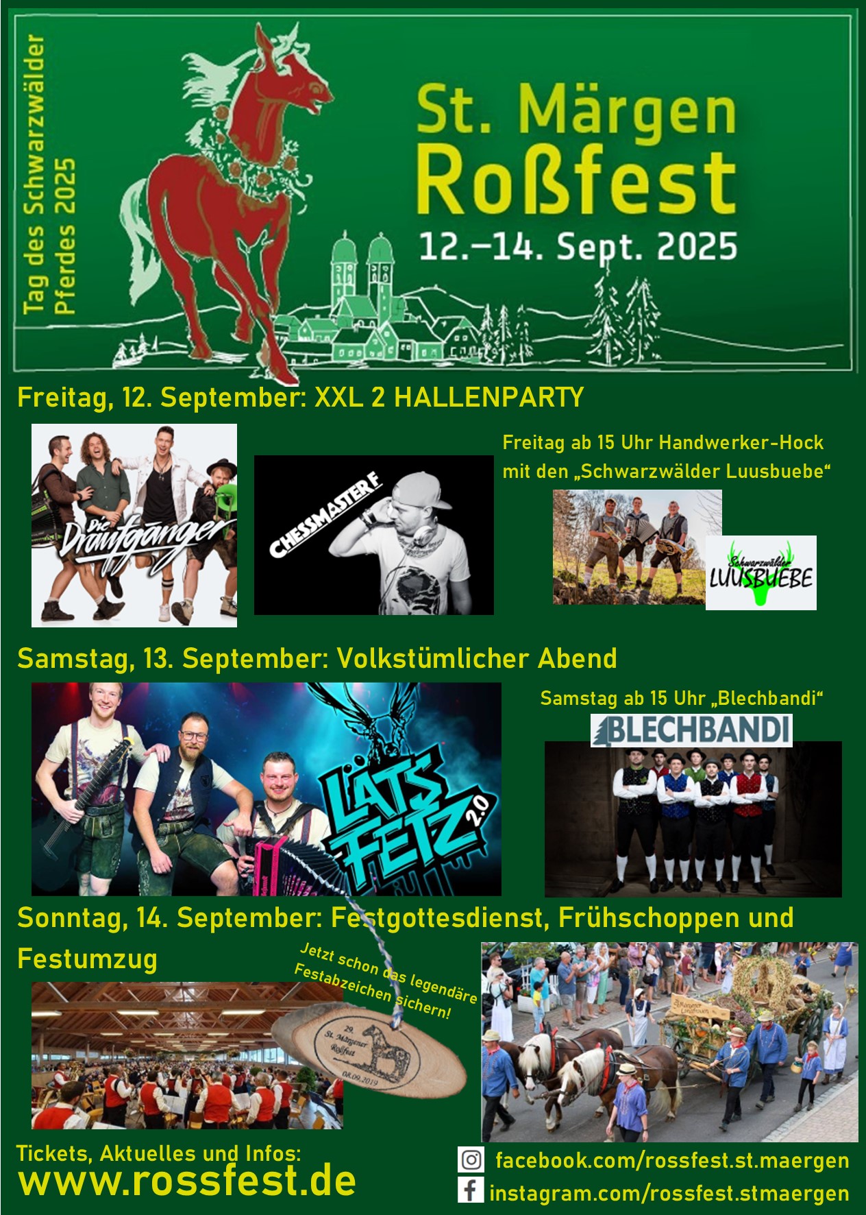 In der Aufbruchstimmung und dem Wunsch nach Neuordnung nach dem 2. Weltkrieg sollte am 8. September 1949 in St. Märgen ein Gemeinde- und Heimatfest auf die Beine gestellt werden. Dazu gehörte auch eine Pferdeschau mit mehreren hundert Pferden aus dem gesamten Zuchtgebiet des Schwarzwälder Kaltblutes und einem Festumzug. Auf der damaligen Festwiese hinter dem heutigen Hotel Hirschen wurden die Tiere prämiert. Auch die Pferdesegnung ist bis heute ein fester Bestandteil des "Roßfestes", welches dadurch bald seinen Namen erhielt. Bis 1953 wurde das Fest jährlich veranstaltet. Aus verschiedenen Gründen wurde der Jahres-Rhythmus später nicht mehr beibehalten, doch das Roßfest selbst wuchs in der Zahl der Pferde und seiner Gäste stetig weiter. Heute findet es alle 3 Jahre am zweiten September-Wochenende von Freitag bis Sonntag bei den Sportplätzen und in Schwarzwald-/Weißtannenhalle statt. 2025 wird es zum 31. Mal von der Gemeinde St. Märgen in Zusammenarbeit mit der Schwarzwälder Pferdezuchtgenossenschaft e. V. und dem Pferdezuchtverband Baden-Württemberg e. V. veranstaltet. Das Fest-Programm bietet generationenübergreifende Veranstaltungen rund ums Schwarzwälder Kaltblut voller Tradition, Brauchtum und Musik. Höhepunkt ist der große historische Festumzug durch den Ort, welcher zuletzt über 20.000 Besucher zählte.